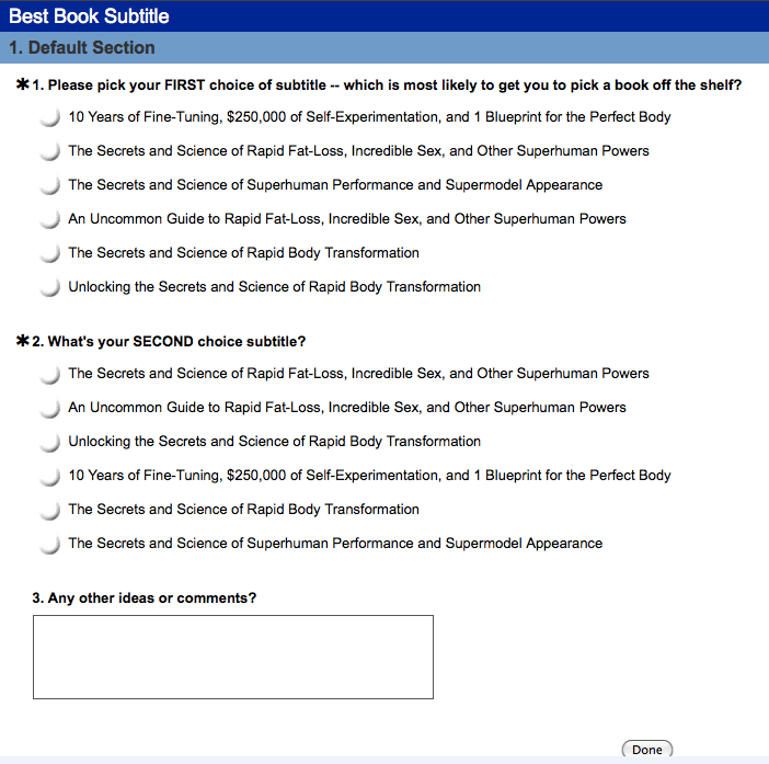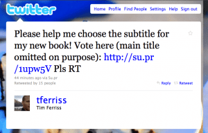 A fantastic marketing tactic. Not only does Ferriss create participation – a relationship – with readers, he’s created a manageable list of potential titles that can be used through internet marketing to connect those readers to the actual book when it’s published, regardless of which title takes the cake.