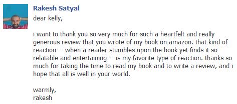 Was I surprised? Absolutely! The personal thank you from the author made me feel a connection with him. I’m glad I read the book and I’m glad I wrote a review. If Satyal publishes another book someday, you can be sure I will read and review it! That is the power of connecting with your readers.